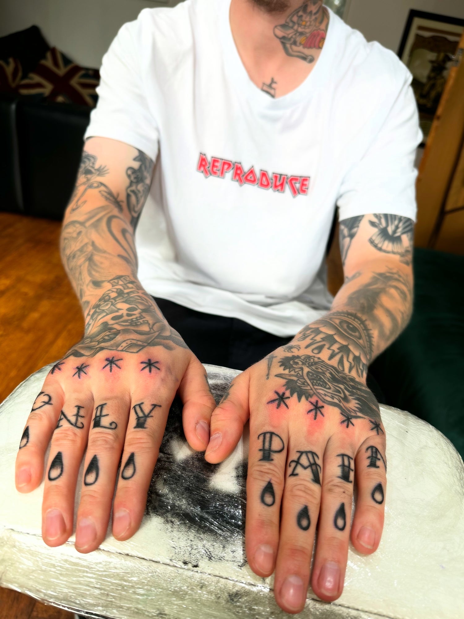 dom0m1 wears our Iron Made t-shirt while getting some job stoppers at 72 Tattoo in Manchester